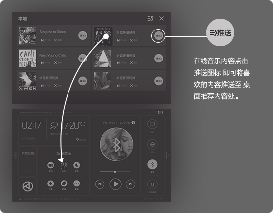 在線音樂内容點擊圖标,即可將(jiāng)喜歡的内容推送至桌面(miàn)推薦内容處。