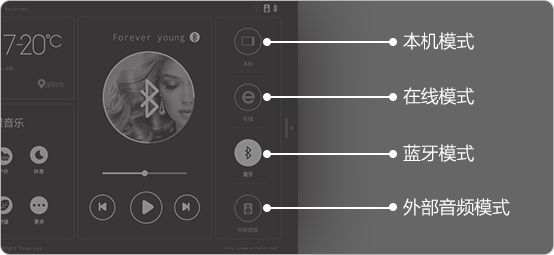 ● 在線模式:進(jìn)入在線模式需要將(jiāng)設備連接網絡,進(jìn)入主頁後(hòu)選擇您喜歡的内容播放,輸出本機在線音源;