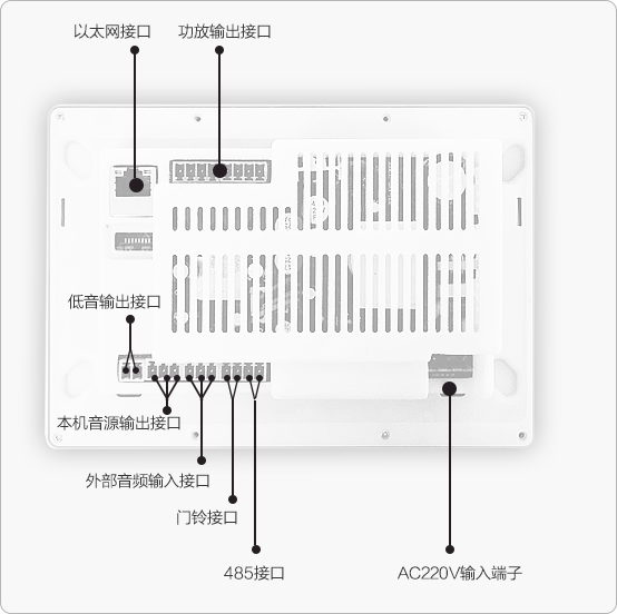 a、控制面(miàn)闆安裝高度保持和開(kāi)關水平,高度1.3-1.4米; b、爲了網絡信号穩定,建議使用網線聯網。 c、音箱線建議選擇50-100芯純銅音箱線。 d、爲了便于後(hòu)期安裝,請使用标配低盒預埋。 e、綠色接線端子全部爲可拆卸端子,請用平口螺絲刀輕撬,拆下後(hòu)接線; f、外部音頻輸入接口,用于外接其它播放器作爲音源使用,音頻輸出接口用于將(jiāng)本系統内的音樂擴展其他功放; g、電源強電接入請直接將(jiāng)強電線撥開(kāi)1厘米左右,直接插入連接器的圓孔内即可,紅色爲火線,黑色爲零線,電源輸出請按照标簽指示對(duì)應連接。