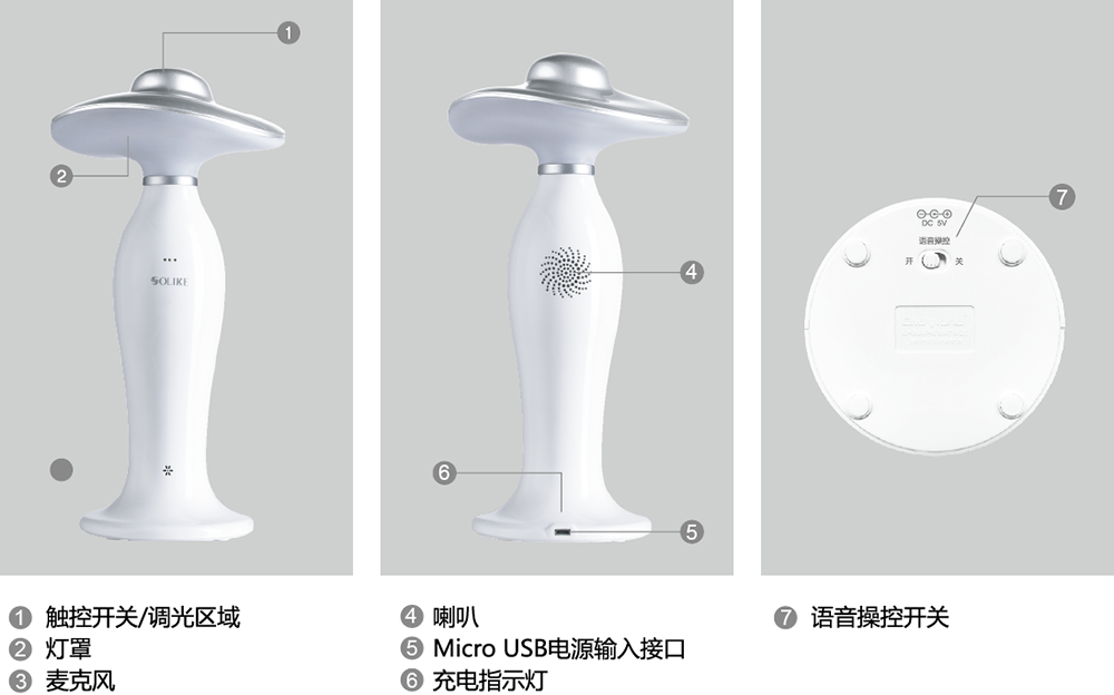 操作說(shuō)明 首次使用:將(jiāng)随産品附送的DC電源連接線的Micro USB插頭連接至智能(néng)語音台燈底座後(hòu)面(miàn)的5V Micro USB電源輸入接口,將(jiāng)另一端的USB插頭插入DC電源适配器的USB插口,并將(jiāng)适配器接入相應的AC電源插座即可正常使用,接入前請注意5V DC電源适配器上标明的額定電壓必須與當地的市電電壓一緻。接入電源之後(hòu),請將(jiāng)台燈底部的語音操控功能(néng)開(kāi)關撥到“開(kāi)”的位置。